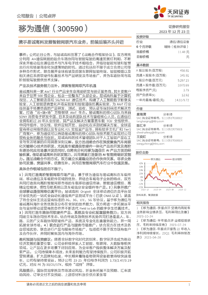 天风证券:移为通信(300590)-携手易诚高科发展智能网联汽车业务,前装后装齐头并进.pdf