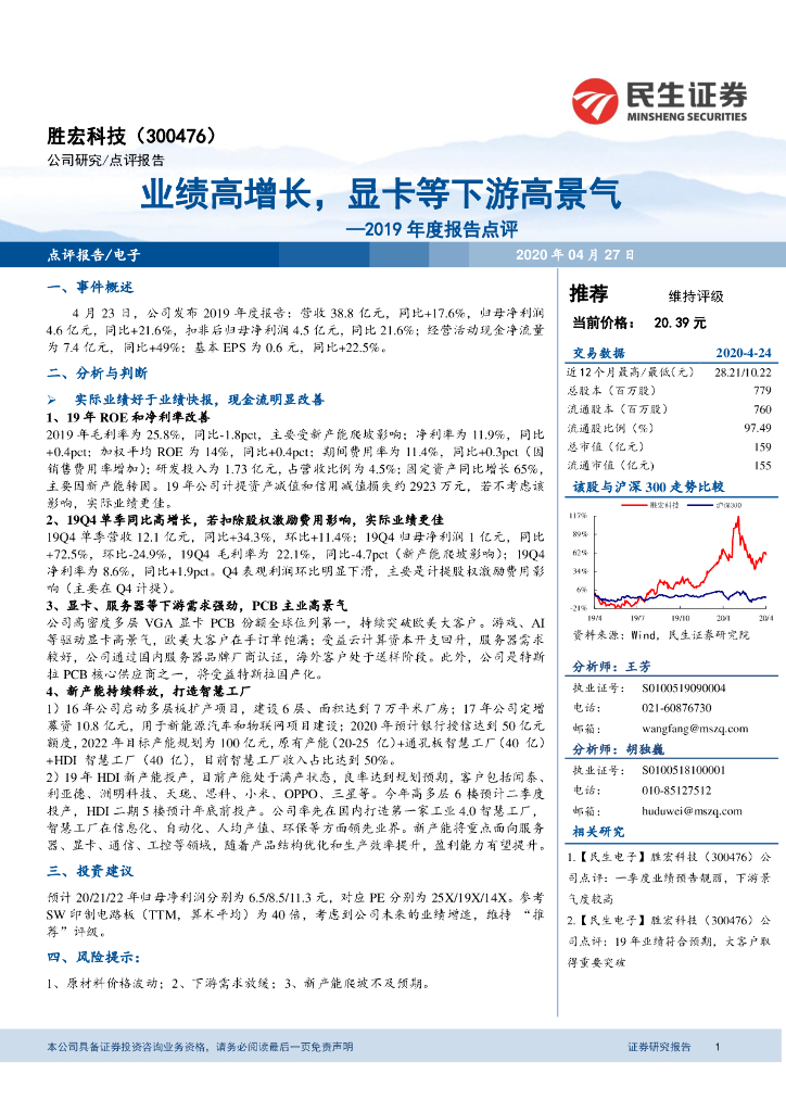 民生证券:胜宏科技(300476)-2019年度报告点评:业绩高增长,显卡等下游高景气.pdf