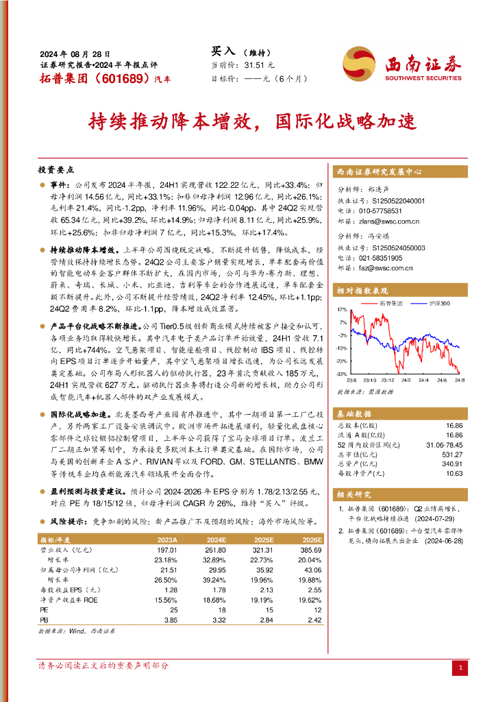 西南证券:拓普集团(601689)-2024半年报点评:持续推动降本增效,国际化战略加速.pdf