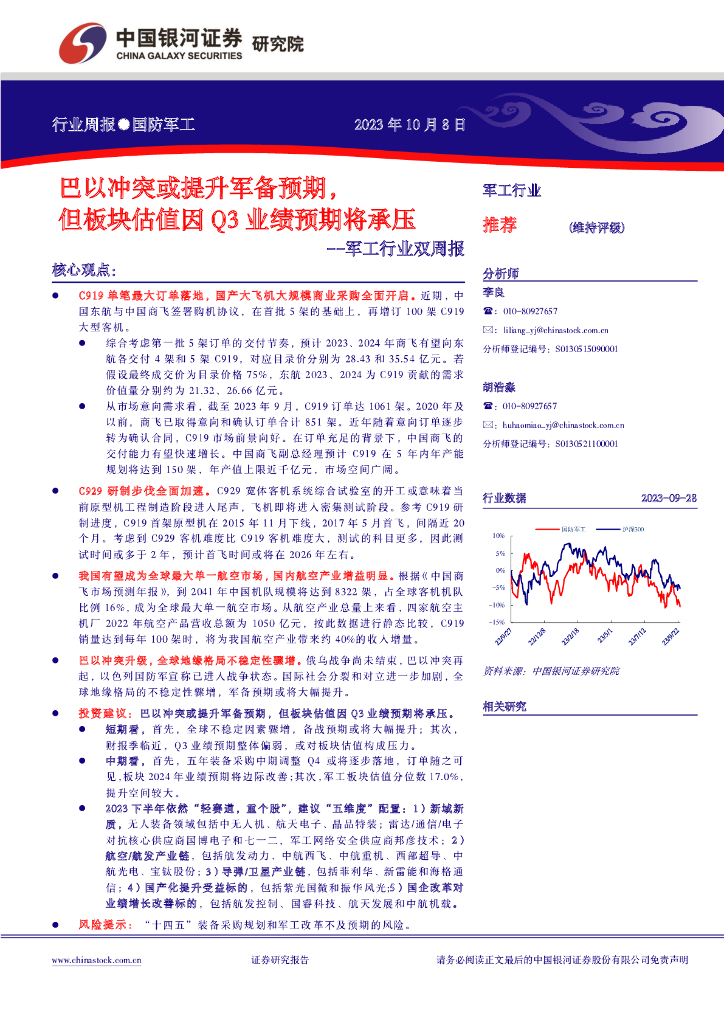 中国银河:军工行业双周报:巴以冲突或提升军备预期,但板块估值因Q3业绩预期将承压.pdf