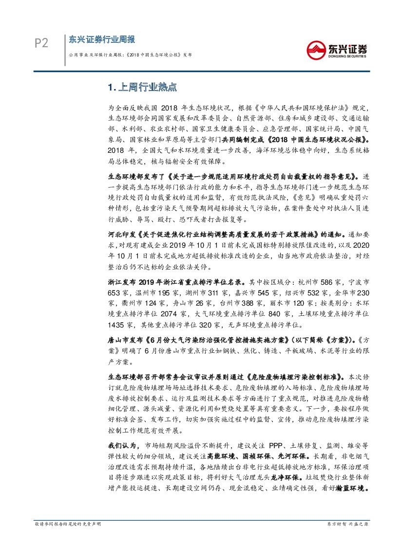 东兴证券:公用事业及环保行业周报:《2018中国生态环境公报》发布.pdf