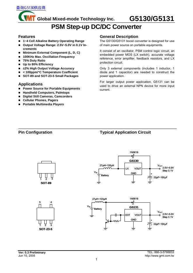 MT G5130/G5131 PSM Step-up DC/DC Converter 数据手册.pdf