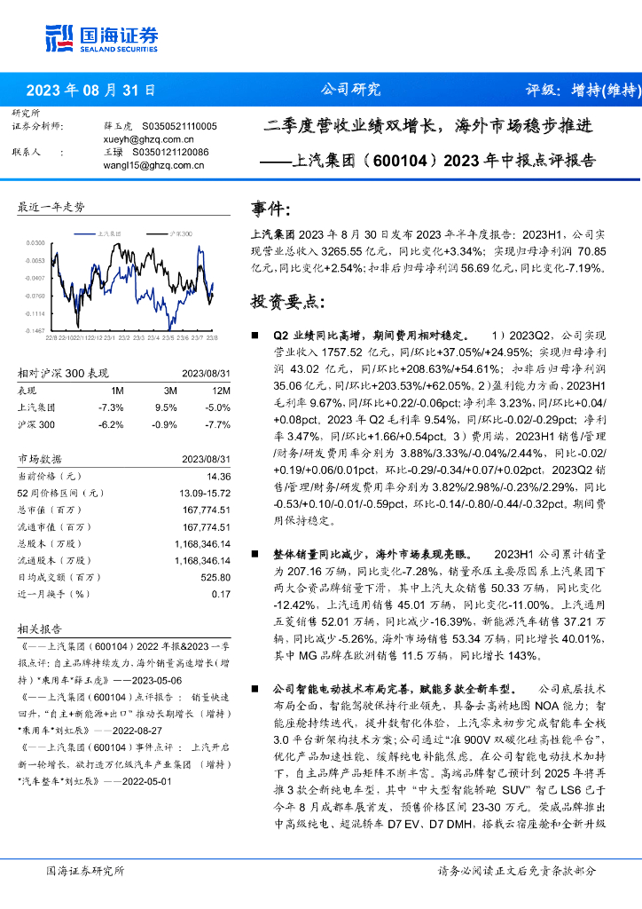 国海证券:上汽集团(600104)-2023年中报点评报告:二季度营收业绩双增长,海外市场稳步推进.pdf
