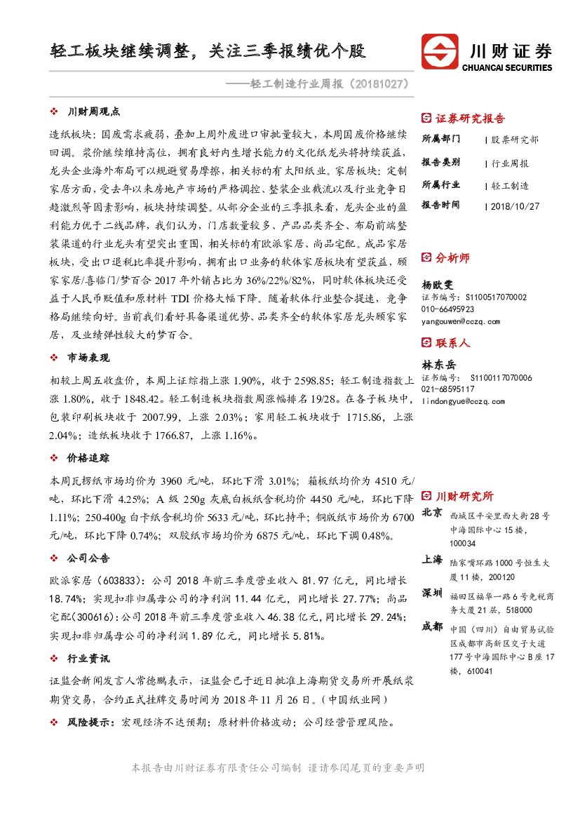 川财证券:轻工制造行业周报:轻工板块继续调整,关注三季报绩优个股.pdf
