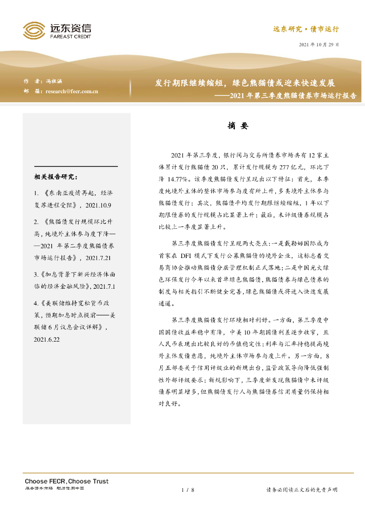 远东资信:发行期限继续缩短,绿色熊猫债或迎来快速发展——2021年第三季度熊猫债券市场运行报告.pdf