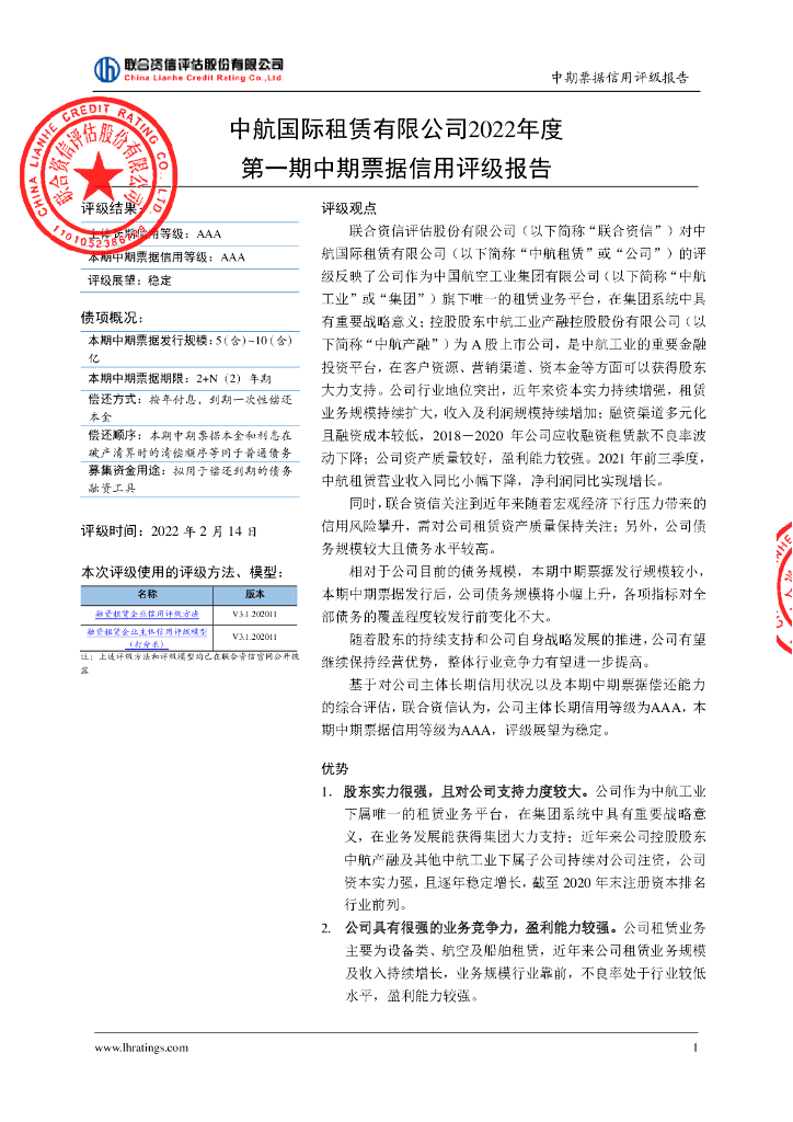联合资信:中航国际租赁有限公司2022年度第一期中期票据信用评级报告.pdf