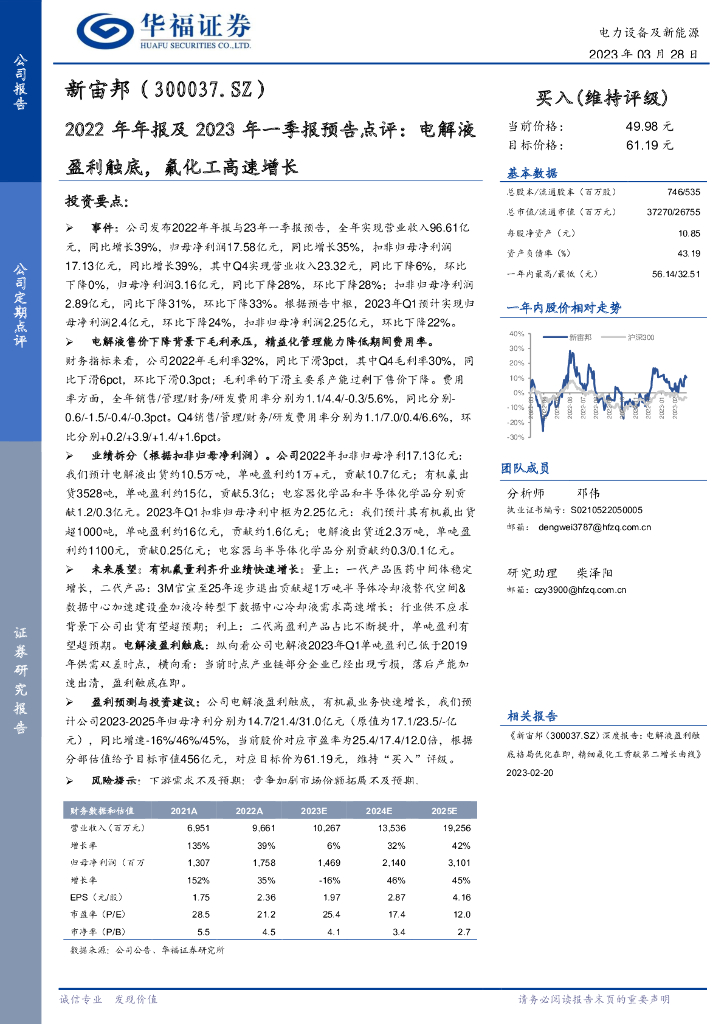 华福证券:新宙邦(300037)-2022年年报及2023年一季报预告点评:电解液盈利触底,氟化工高速增长.pdf