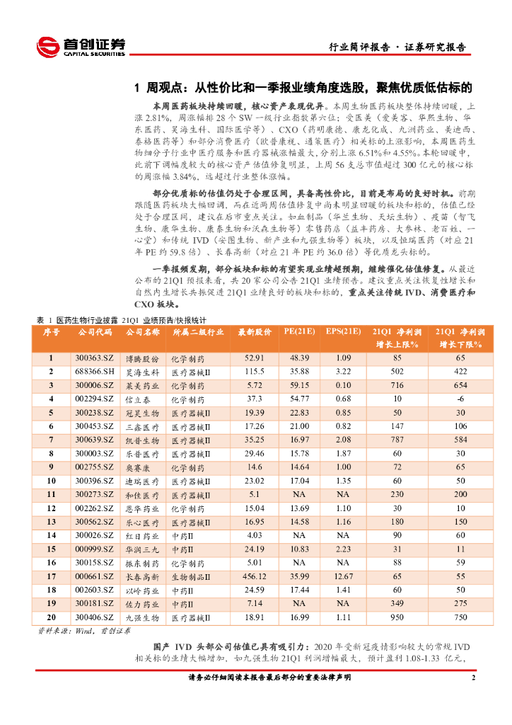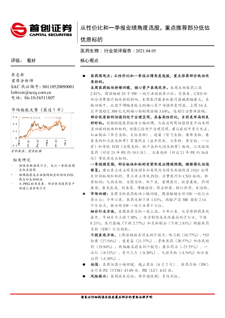 首创证券:医药生物行业简评报告:从性价比和一季报业绩角度选股,重点推荐部分低估优质标的.pdf