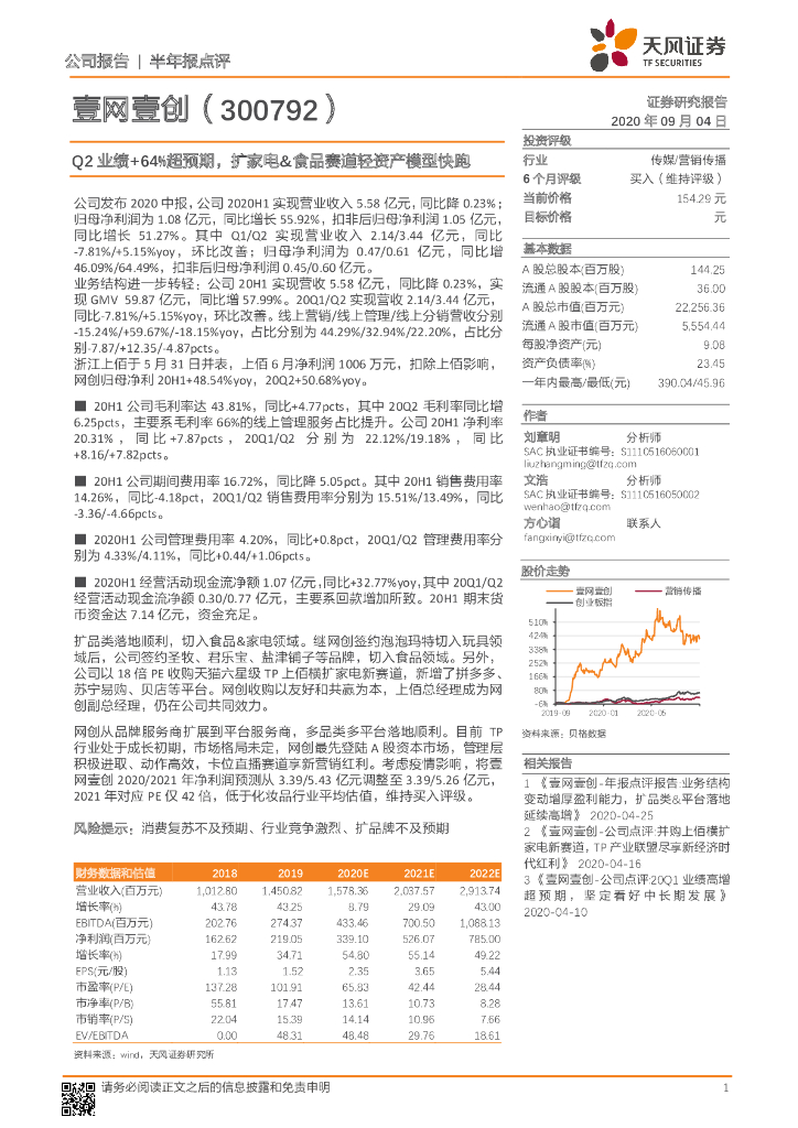 天风证券:壹网壹创(300792)-Q2业绩+64%超预期,扩家电&食品赛道轻资产模型快跑.pdf