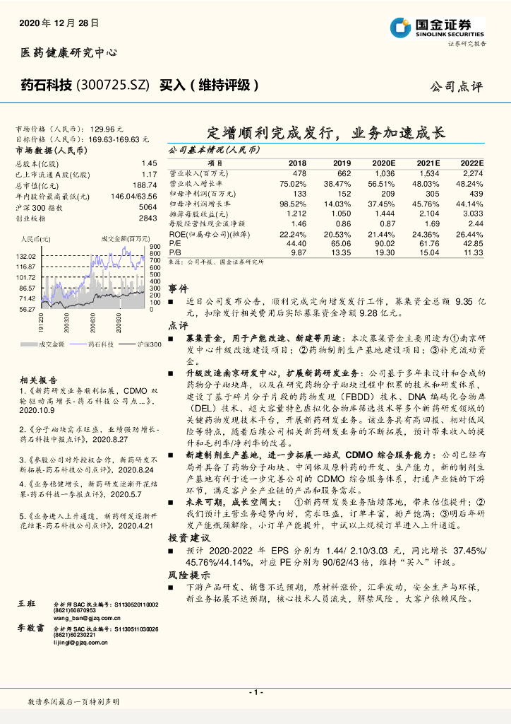 国金证券:药石科技(300725)-定增顺利完成发行,业务加速成长.pdf