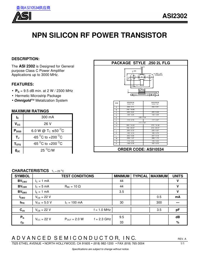 ASI ASI2302 NPN SILICON RF POWER TRANSISTOR 数据手册.pdf
