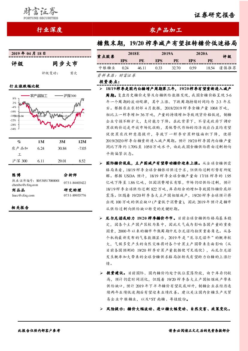 财富证券:农产品加工行业深度:糖熊末期,19/20榨季减产有望扭转糖价低迷格局.pdf