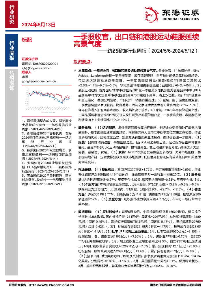 东海证券:纺织服饰行业周报:一季报收官,出口链和港股运动鞋服延续高景气度.pdf