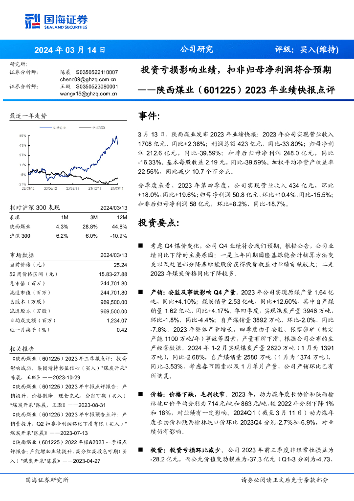 国海证券:陕西煤业(601225)-2023年业绩快报点评:投资亏损影响业绩,扣非归母净利润符合预期.pdf