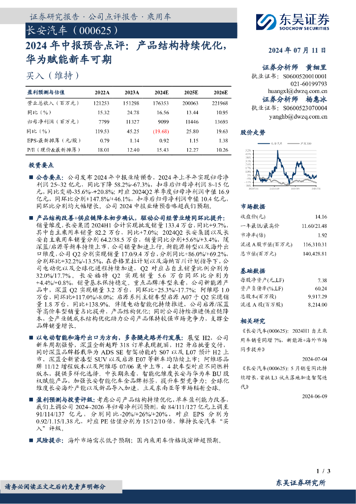 东吴证券:长安汽车(000625)-2024年中报预告点评:产品结构持续优化,华为赋能新车可期.pdf