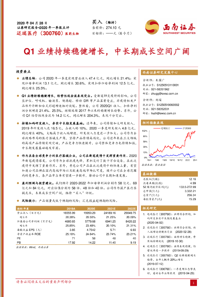 西南证券:迈瑞医疗(300760)-Q1业绩持续稳健增长,中长期成长空间广阔.pdf