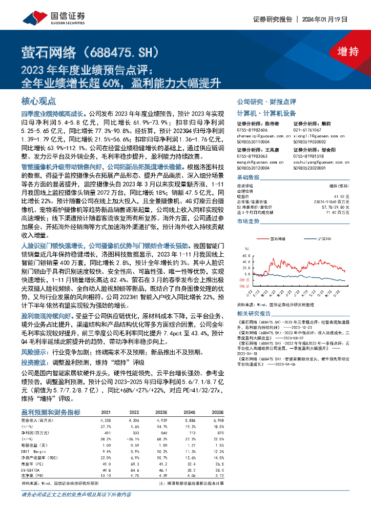 国信证券:萤石网络(688475)-2023年年度业绩预告点评:全年业绩增长超60%,盈利能力大幅提升.pdf