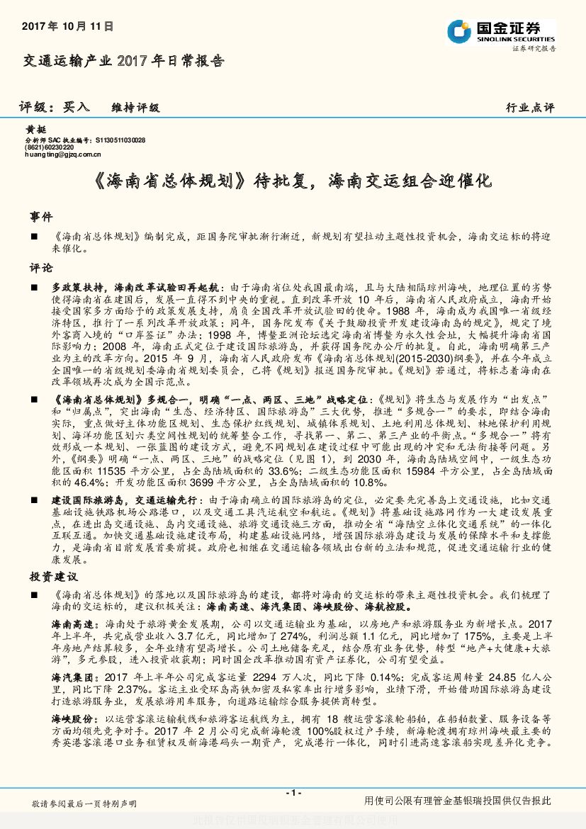 国金证券:交通运输产业2017年日常报告:《海南省总体规划》待批复,海南交运组合迎催化.pdf