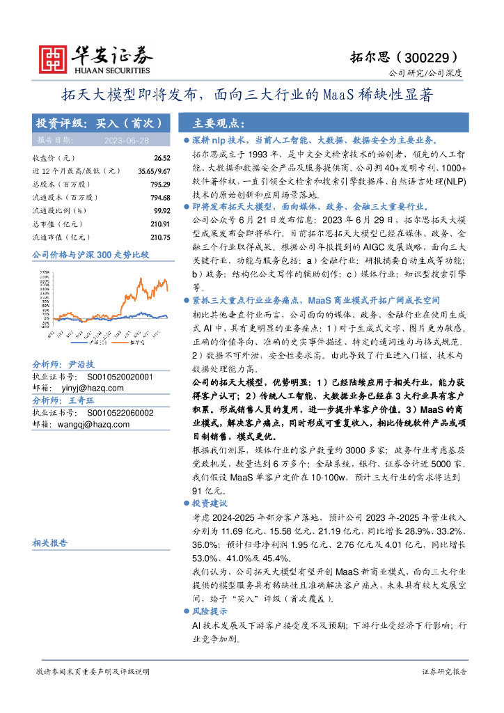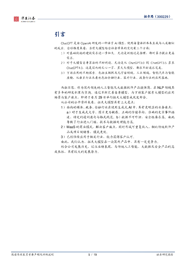 华安证券:拓尔思(300229)-拓天大模型即将发布,面向三大行业的MaaS稀缺性显著.pdf
