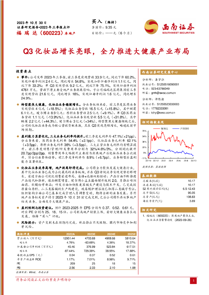 西南证券:福瑞达(600223)-2023年三季报点评:Q3化妆品增长亮眼,全力推进大健康产业布局.pdf