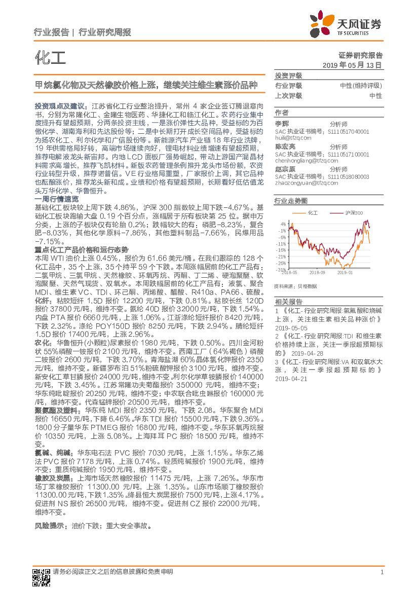天风证券:化工行业研究周报:甲烷氯化物及天然橡胶价格上涨,继续关注维生素涨价品种.pdf
