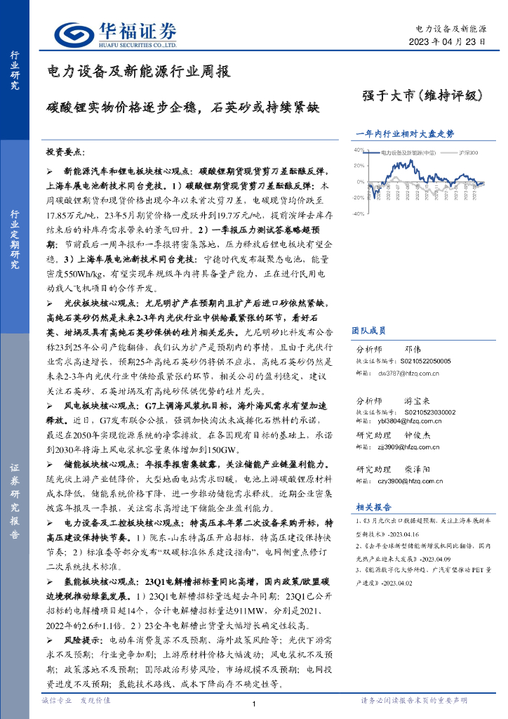 华福证券:电力设备及新能源行业周报:碳酸锂实物价格逐步企稳,石英砂或持续紧缺.pdf