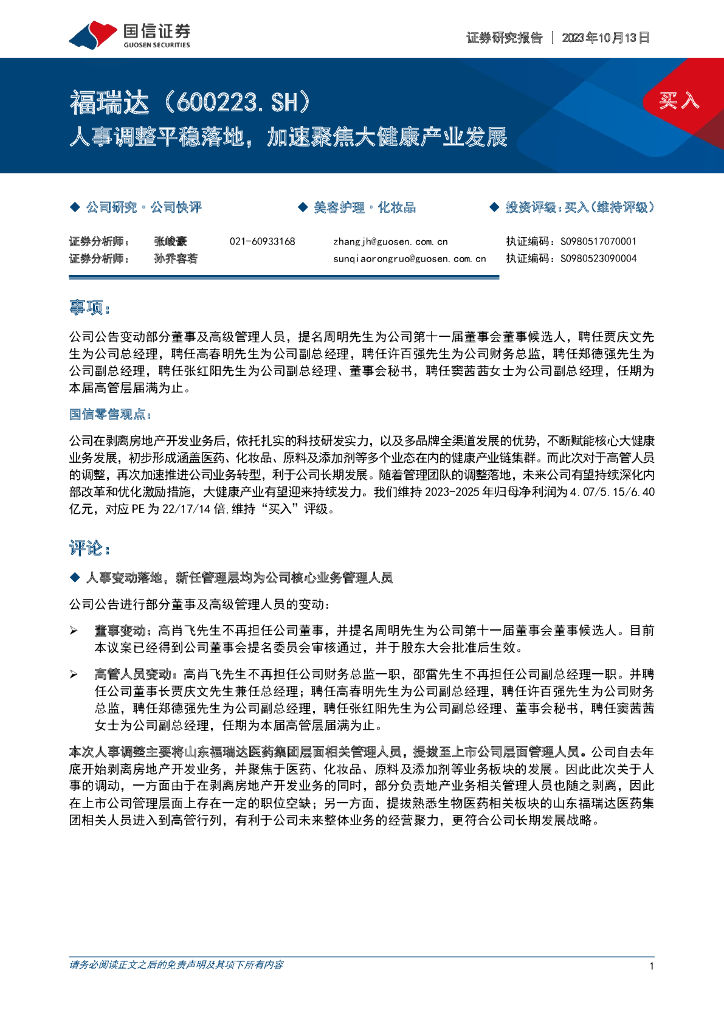 国信证券:福瑞达(600223)-人事调整平稳落地,加速聚焦大健康产业发展.pdf