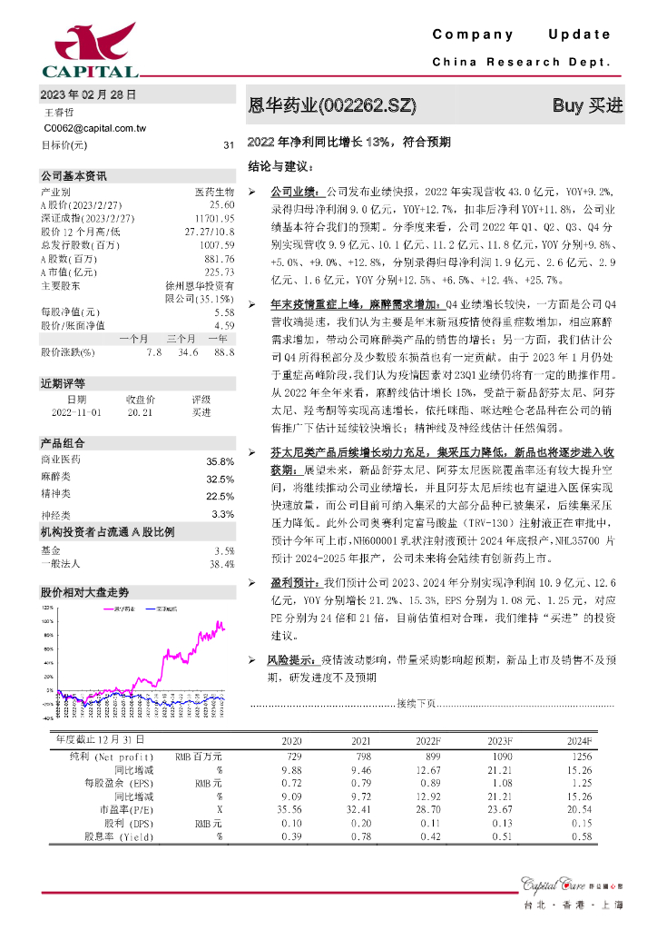 群益证券:恩华药业(002262)-2022年净利同比增长13%,符合预期.pdf