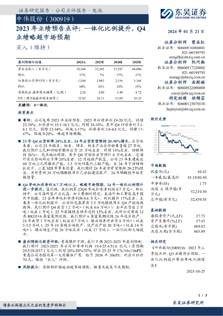 东吴证券:中伟股份(300919)-2023年业绩预告点评:一体化比例提升,Q4业绩略超市场预期.pdf