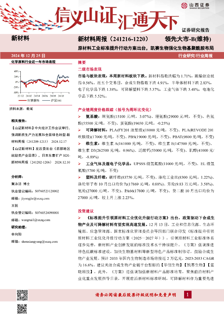 山西证券:新材料行业周报:新材料周报(241216-1220)原材料工业标准提升行动方案出台,凯赛生物强化生物基聚酰胺布局.pdf