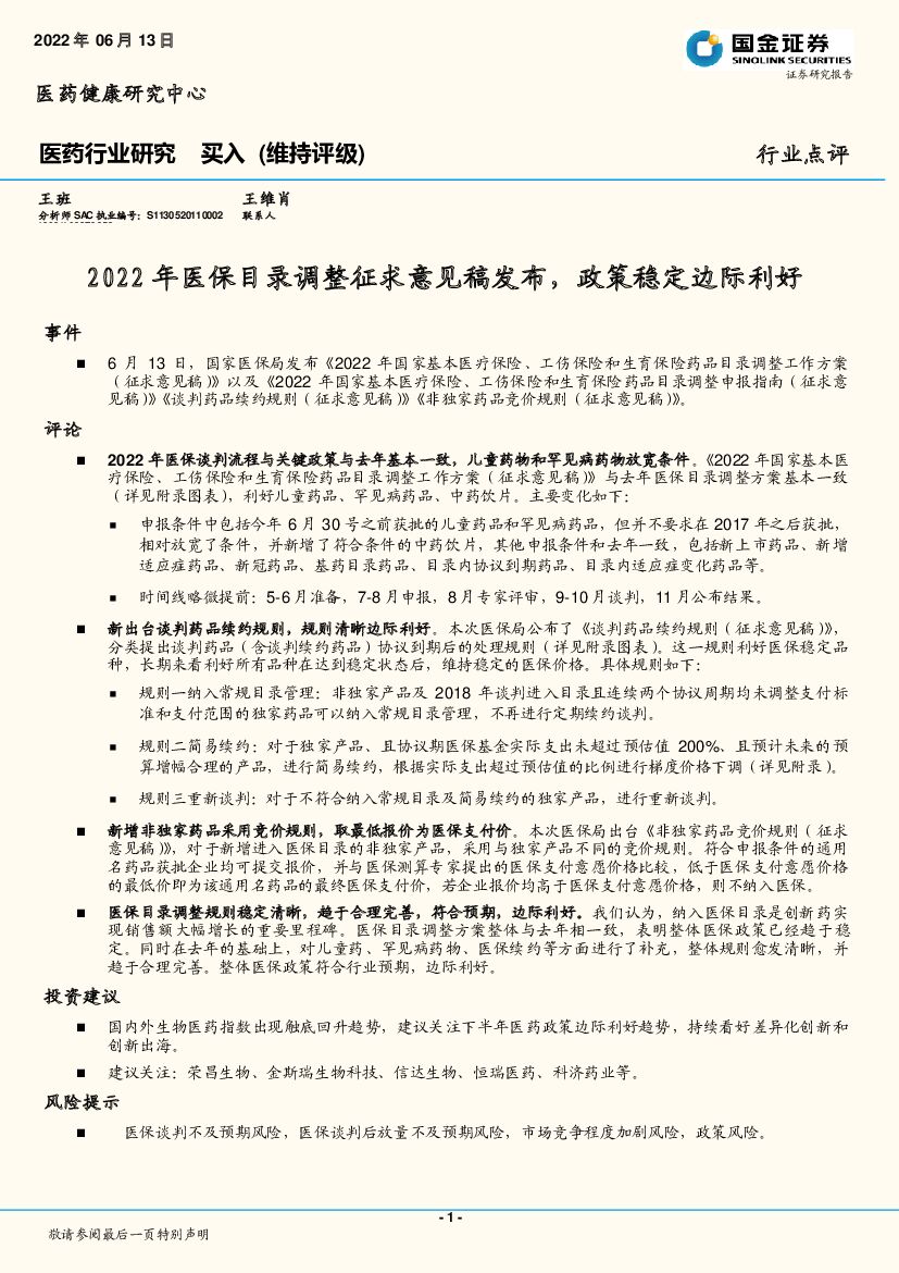 国金证券:医药行业研究:2022年医保目录调整征求意见稿发布,政策稳定边际利好.pdf