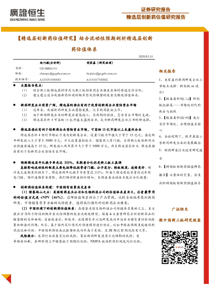 广证恒生证券研究所:医药:【精选层创新药估值研究】结合流动性预期剖析精选层创新药估值体系.pdf