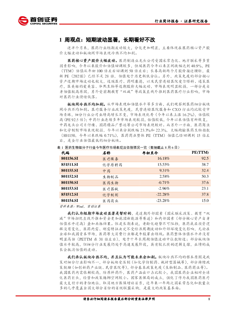 首创证券:医药生物行业简评报告:短期波动显著,长期看好不改.pdf