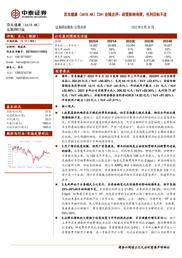 中泰证券:京东健康(06618)港股公司研究报告-22H1业绩点评:政策影响有限,毛利目标不改.pdf