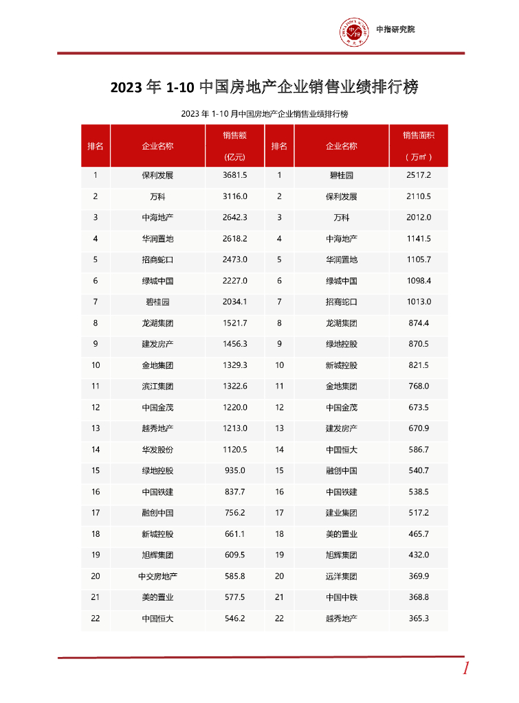 中国指数研究院:2023年1-10中国房地产企业销售业绩排行榜.pdf