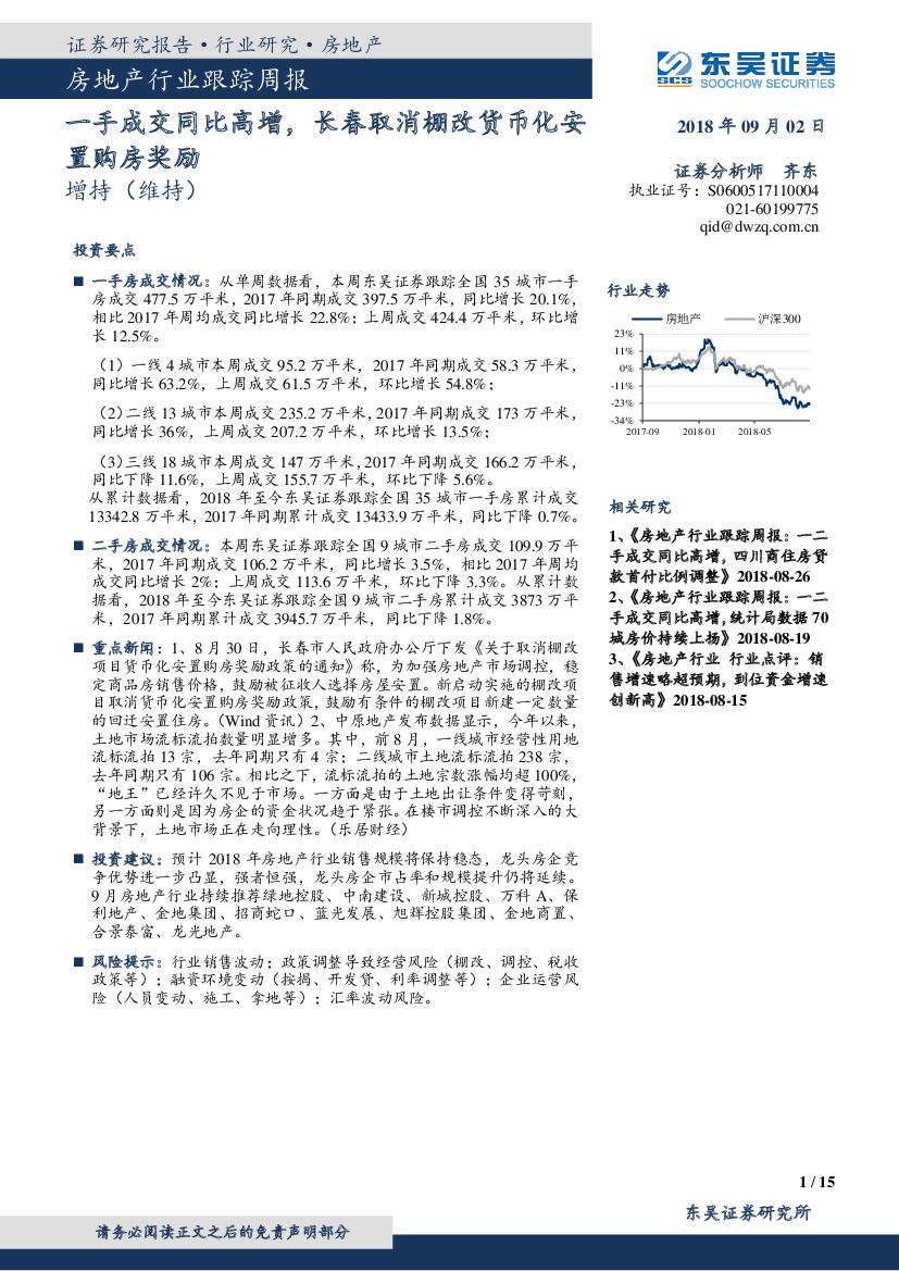 东吴证券:房地产行业跟踪周报:一手成交同比高增,长春取消棚改货币化安置购房奖励.pdf