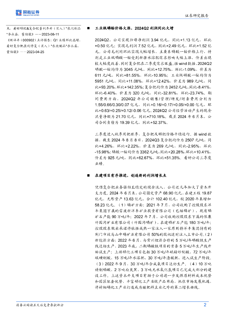 国海证券:新洋丰(000902)-2024年中报点评:2024Q2业绩同比大增,多项目有序推进.pdf