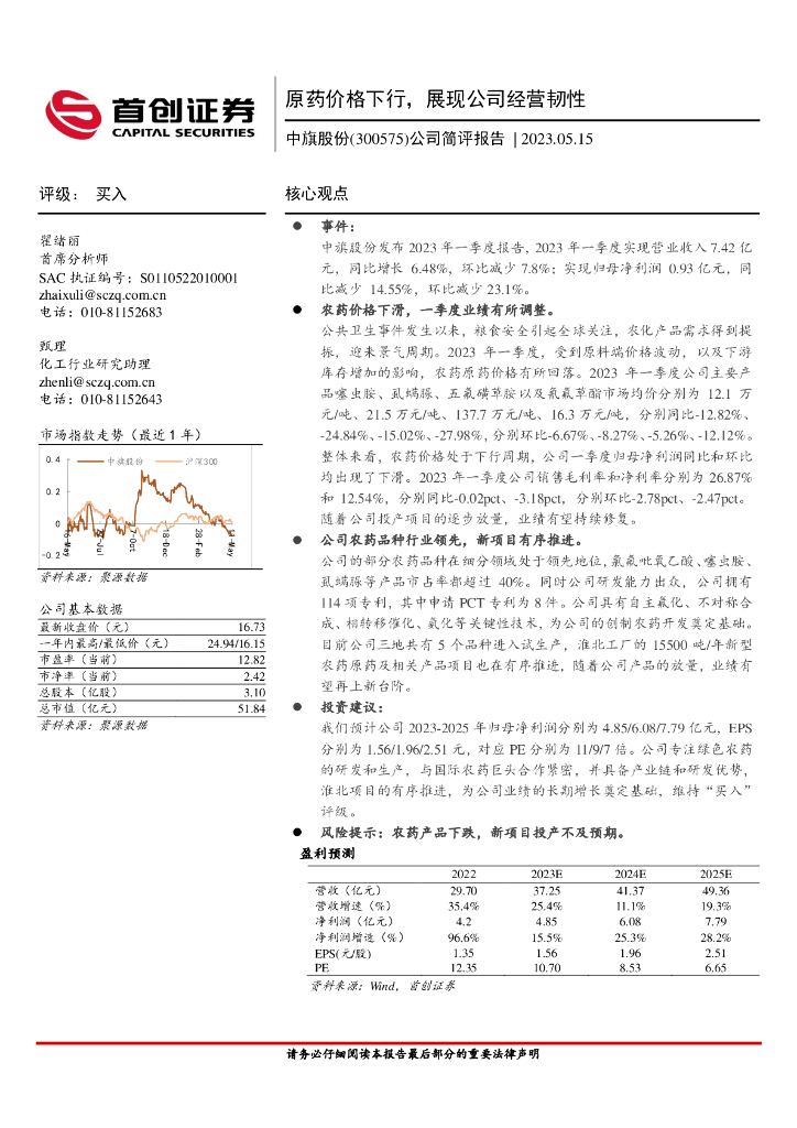 首创证券:中旗股份(300575)-公司简评报告:原药价格下行,展现公司经营韧性.pdf