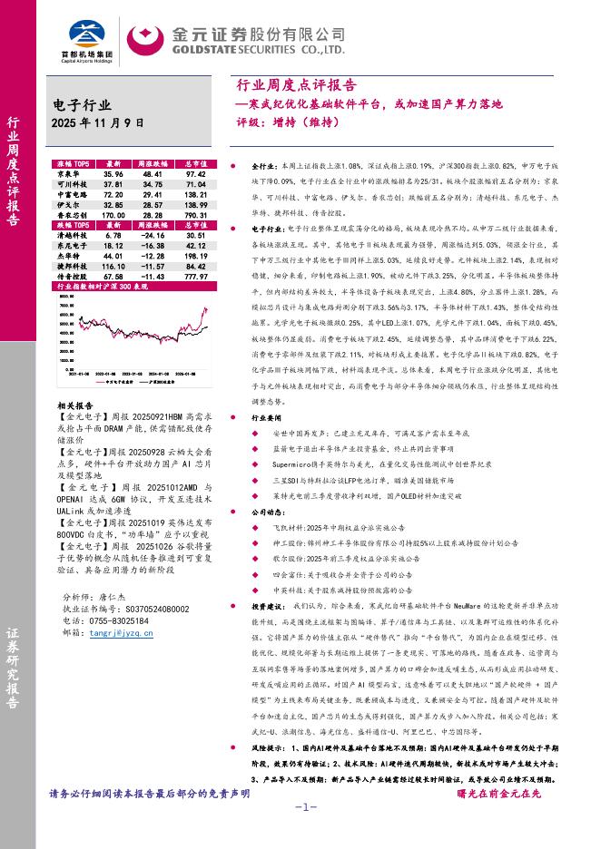 金元证券:电子行业周度点评报告:寒武纪优化基础软件平台,或加速国产算力落地.pdf