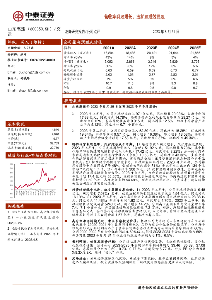 中泰证券:山东高速(600350)-营收净利双增长,改扩建成效显现.pdf