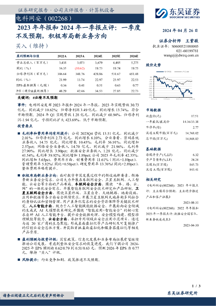 东吴证券:电科网安(002268)-2023年年报和2024年一季报点评:一季度不及预期,积极布局新业务方向.pdf