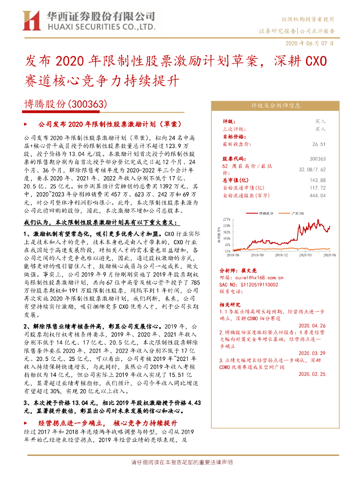 华西证券:博腾股份(300363)-发布2020年限制性股票激励计划草案,深耕CXO赛道核心竞争力持续提升.pdf
