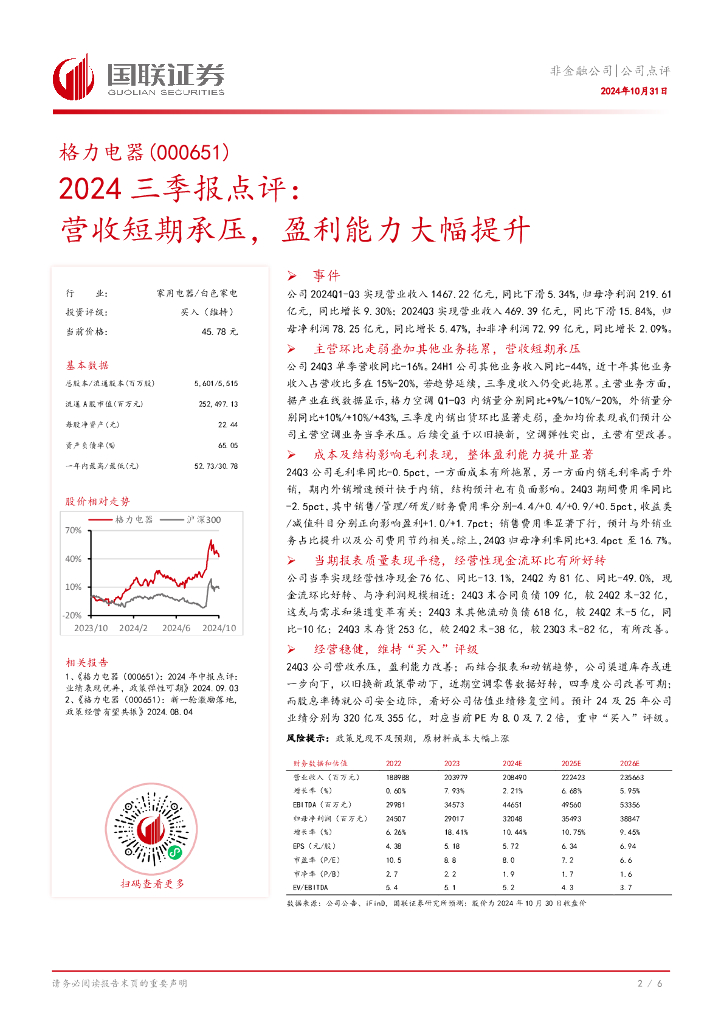 国联证券:格力电器(000651)-2024三季报点评:营收短期承压,盈利能力大幅提升.pdf