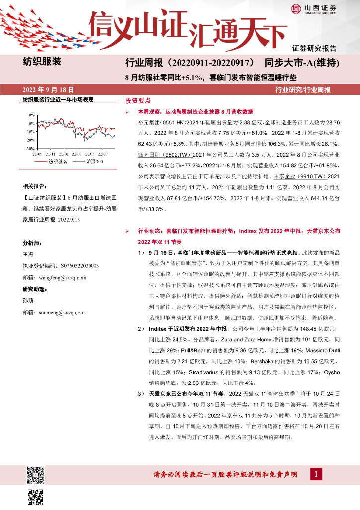 山西证券:纺织服装行业周报:8月纺服社零同比+5.1%,喜临门发布智能恒温睡疗垫.pdf