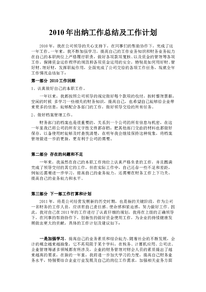 2010年出纳工作总结及工作计划.doc