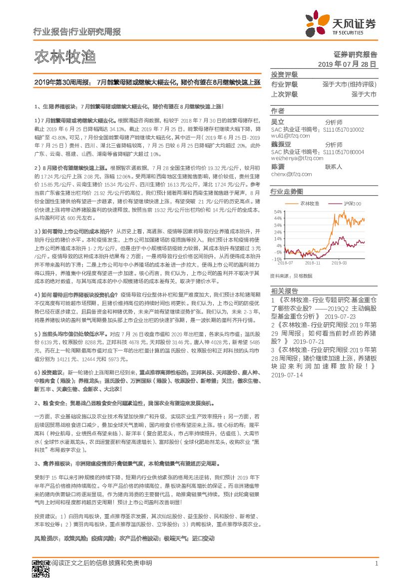天风证券:农林牧渔2019年第30周周报:7月能繁母猪或继续大幅去化,猪价有望在8月继续快速上涨.pdf