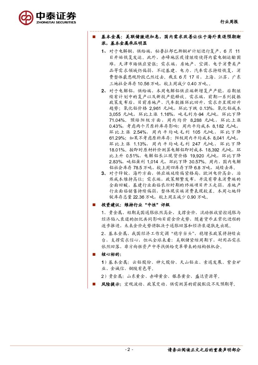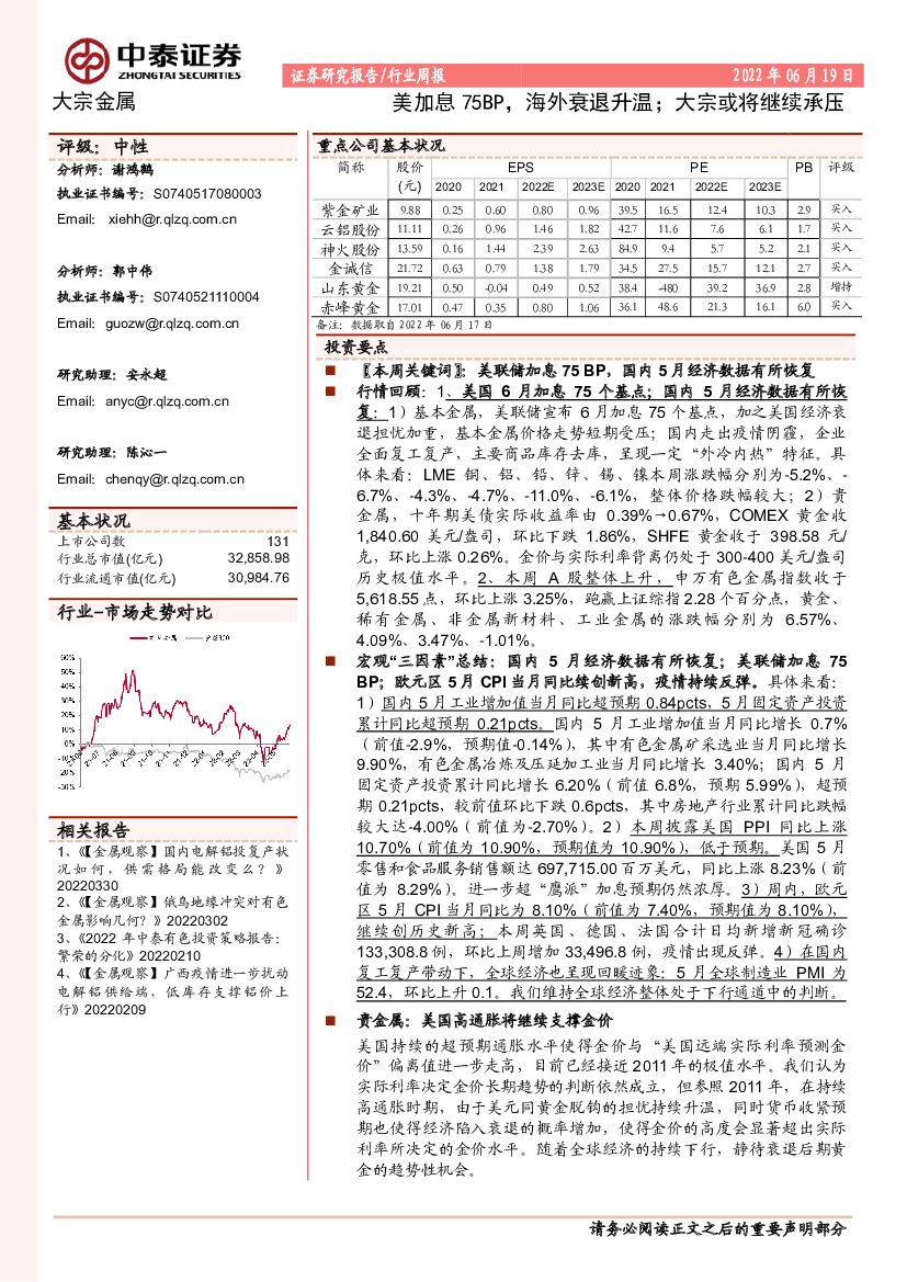 中泰证券:大宗金属行业周报:美加息75BP,海外衰退升温;大宗或将继续承压.pdf