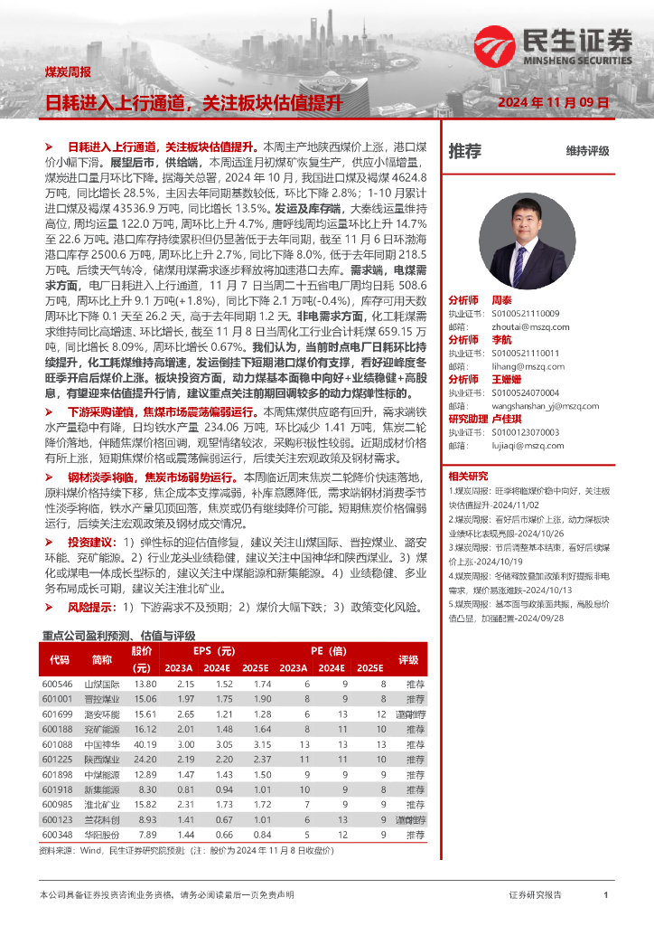 民生证券:煤炭周报:日耗进入上行通道,关注板块估值提升.pdf