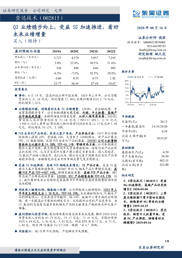 东吴证券:崇达技术(002815)-Q2业绩稳步向上,受益5G加速推进,看好未来业绩增量.pdf