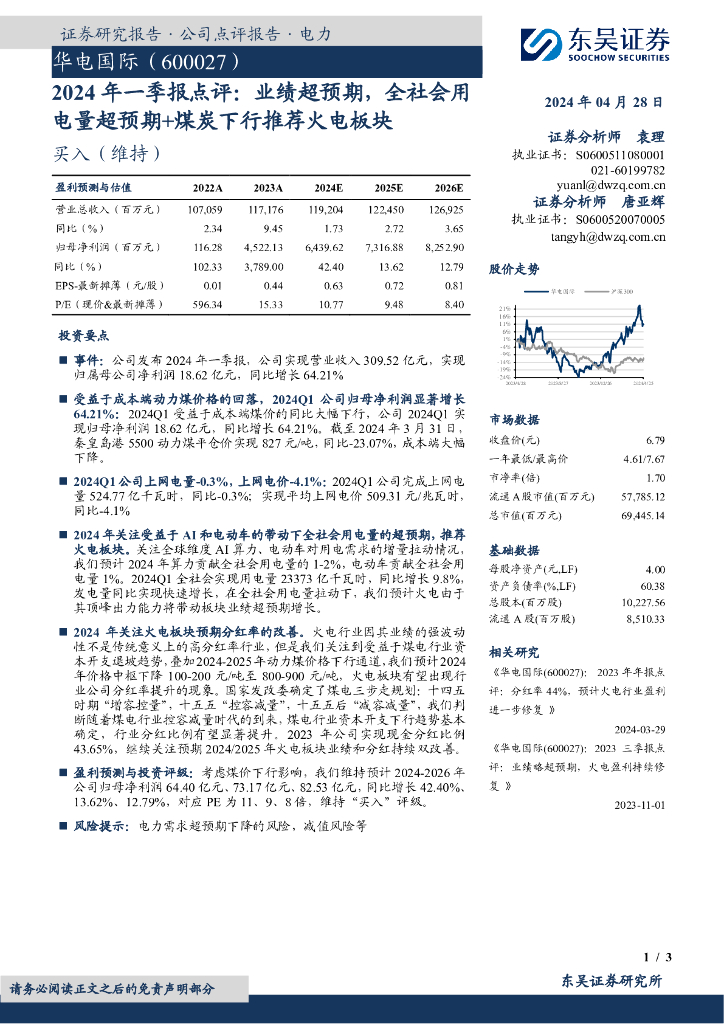 东吴证券:华电国际(600027)-2024年一季报点评:业绩超预期,全社会用电量超预期+煤炭下行推荐火电板块.pdf